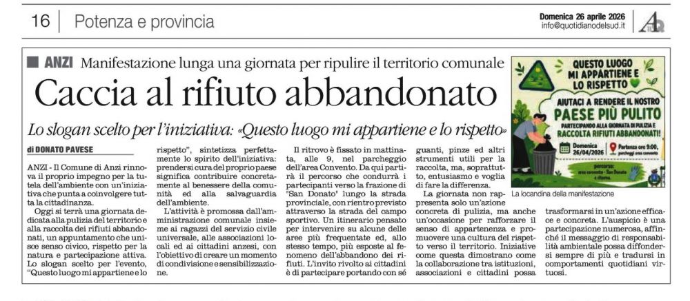 ANZI - Il Comune di Anzi rinnova il proprio impegno per la tutela dell’ambiente con un’iniziativa che punta a coinvolgere tutta la cittadinanza. Domenica 26 aprile si terrà una giornata dedicata alla pulizia del territorio ed alla raccolta dei rifiuti abbandonati, un appuntamento che unisce senso civico, rispetto per la natura e partecipazione attiva. Lo slogan scelto per l’evento, “Questo luogo mi appartiene e lo rispetto”, sintetizza perfettamente lo spirito dell’iniziativa: prendersi cura del proprio paese significa contribuire concretamente al benessere della comunità ed alla salvaguardia dell’ambiente. L’attività è promossa dall’amministrazione comunale insieme ai ragazzi del servizio civile universale, alle associazioni locali ed ai cittadini anzesi, con l’obiettivo di creare un momento di condivisione e sensibilizzazione. Il ritrovo è fissato in mattinata, alle 9, presso il parcheggio dell’area Convento. Da qui partirà il percorso che condurrà i partecipanti verso la frazione di "San Donato" lungo la strada provinciale, con rientro previsto attraverso la strada del campo sportivo. Un itinerario pensato per intervenire su alcune delle aree più frequentate ed, allo stesso tempo, più esposte al fenomeno dell’abbandono dei rifiuti. L’invito rivolto ai cittadini è di partecipare portando con sé guanti, pinze ed altri strumenti utili per la raccolta, ma, soprattutto, entusiasmo e voglia di fare la differenza. La giornata non rappresenta solo un’azione concreta di pulizia, ma anche un’occasione per rafforzare il senso di appartenenza e promuovere una cultura del rispetto verso il territorio. Iniziative come questa dimostrano come la collaborazione tra istituzioni, associazioni e cittadini possa trasformarsi in un’azione efficace e concreta. L’auspicio è una partecipazione numerosa, affinché il messaggio di responsabilità ambientale possa diffondersi sempre di più e tradursi in comportamenti quotidiani virtuosi. (Donato Pavese)