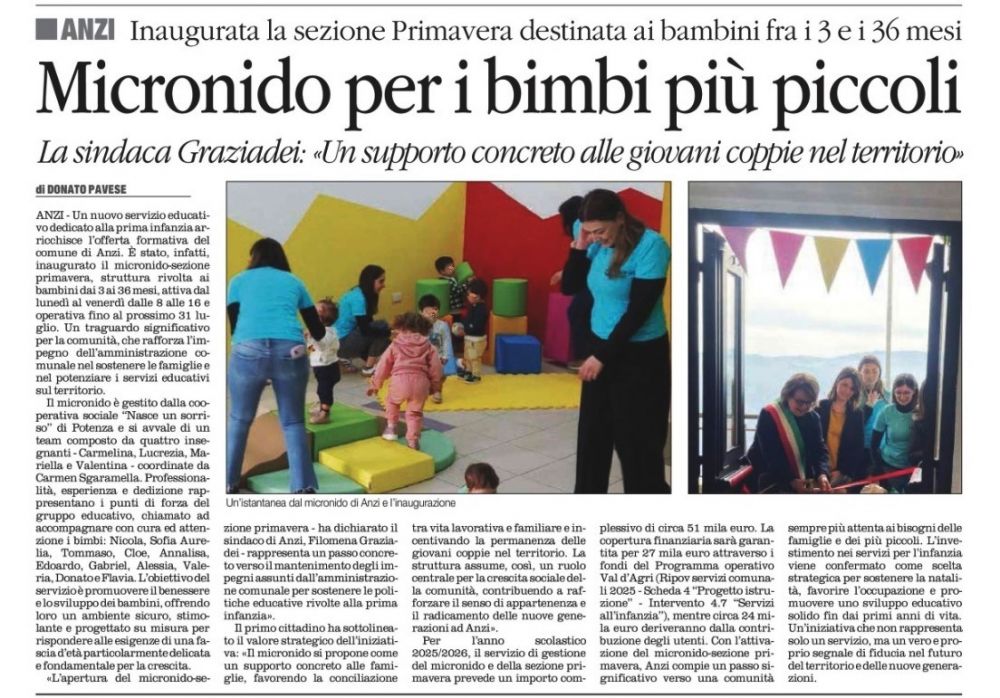 ANZI - Un nuovo servizio educativo dedicato alla prima infanzia arricchisce l’offerta formativa del comune di Anzi. È stato, infatti, inaugurato il micronido-sezione primavera, struttura rivolta ai bambini dai 3 ai 36 mesi, attiva dal lunedì al venerdì dalle ore 8 alle 16 e operativa fino al prossimo 31 luglio. Un traguardo significativo per la comunità, che rafforza l’impegno dell’amministrazione comunale nel sostenere le famiglie e nel potenziare i servizi educativi sul territorio. Il micronido è gestito dalla cooperativa sociale “Nasce un sorriso” di Potenza e si avvale di un team composto da quattro insegnanti - Carmelina, Lucrezia, Mariella e Valentina - coordinate da Carmen Sgaramella. Professionalità, esperienza e dedizione rappresentano i punti di forza del gruppo educativo, chiamato ad accompagnare con cura ed attenzione i bimbi: Nicola, Sofia Aurelia, Tommaso, Cloe, Annalisa, Edoardo, Gabriel, Alessia, Valeria, Donato e Flavia. L’obiettivo del servizio è promuovere il benessere e lo sviluppo dei bambini, offrendo loro un ambiente sicuro, stimolante e progettato su misura per rispondere alle esigenze di una fascia d’età particolarmente delicata e fondamentale per la crescita. «L’apertura del micronido-sezione primavera - ha dichiarato il sindaco di Anzi, Filomena Graziadei - rappresenta un passo concreto verso il mantenimento degli impegni assunti dall’amministrazione comunale per sostenere le politiche educative rivolte alla prima infanzia». Il primo cittadino ha, inoltre, sottolineato il valore strategico dell’iniziativa: «il micronido si propone come un supporto concreto alle famiglie, favorendo la conciliazione tra vita lavorativa e familiare e incentivando la permanenza delle giovani coppie nel territorio. La struttura assume, così, un ruolo centrale per la crescita sociale della comunità, contribuendo a rafforzare il senso di appartenenza e il radicamento delle nuove generazioni ad Anzi». Per l’anno scolastico 2025/2026, il servizio di gestione del micronido e della sezione primavera prevede un importo complessivo di circa 51 mila euro. La copertura finanziaria sarà garantita per 27 mila euro attraverso i fondi del Programma operativo Val d’Agri (Ripov servizi comunali 2025 - Scheda 4 “Progetto istruzione” - Intervento 4.7 “Servizi all’infanzia”), mentre circa 24 mila euro deriveranno dalla contribuzione degli utenti. Con l’attivazione del micronido-sezione primavera, Anzi compie un passo significativo verso una comunità sempre più attenta ai bisogni delle famiglie e dei più piccoli. L’investimento nei servizi per l’infanzia viene confermato come scelta strategica per sostenere la natalità, favorire l’occupazione e promuovere uno sviluppo educativo solido fin dai primi anni di vita. Un’iniziativa che non rappresenta solo un servizio, ma un vero e proprio segnale di fiducia nel futuro del territorio e delle nuove generazioni. (Donato Pavese)