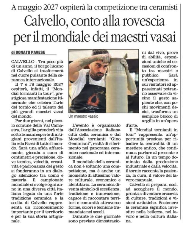 CALVELLO - Tra poco più di un anno, il borgo lucano di Calvello si trasformerà nel cuore pulsante della ceramica internazionale. Il 7 e l'8 maggio 2027 ospiterà, infatti, il "Mondial tornianti in tour", prestigiosa manifestazione itinerante che celebra l'arte del tornio ed il talento dei più grandi maestri vasai del mondo. Per due giorni, nel piccolo comune della Val Camastra, l'argilla prenderà vita sotto le mani esperte di artigiani provenienti dall'Italia e da Paesi di tutto il mondo. Sarà una sfida affascinante, giocata a suon di centimetri e precisione, dove tecnica, velocità, creatività e padronanza del gesto si fonderanno in un dialogo silenzioso tra uomo e materia. Il campionato mondiale si svolge ogni anno in una diversa città italiana legata da una forte tradizione ceramica e la scelta di Calvello rappresenta un riconoscimento importante per il territorio e per la sua storia artigianale. L'evento è organizzato dall'Associazione italiana città della ceramica e dal Mondial tornianti "Gino Geminiani", realtà di riferimento nel panorama ceramico nazionale ed internazionale. Il mondiale della ceramica non è soltanto una competizione, ma è anche un momento di altissimo valore culturale, economico e identitario. La ceramica diventa simbolo di eccellenza, tradizione e innovazione, capace di raccontare territori e comunità attraverso forme, colori e tecniche tramandate nei secoli. Durante le due giornate sono previste dimostrazioni dal vivo, prove di abilità, esposizioni uniche ed occasioni di confronto tra maestri e pubblico. Sarà un'esperienza in cui visitatori ed appassionati potranno osservare da vicino il gesto sapiente che, con pochi movimenti decisi, trasforma un semplice blocco di argilla in un'opera d'arte. Il "Mondial tornianti in tour" rappresenta un'opportunità preziosa per ribadire la centralità di un mestiere antico, che continua a parlare al presente e al futuro. In un tempo dominato dalla produzione industriale e dalla velocità, il tornio racconta la pazienza, la cura, il valore del lavoro manuale. Calvello si prepara, così, ad accogliere il mondo, pronta a diventare crocevia di culture, tradizioni e visioni artistiche. Sostenere la ceramica significa investire nella bellezza, nel lavoro e nella cultura italiana. (Donato Pavese)