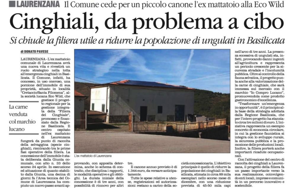 LAURENZANA - L’ex mattatoio comunale di Laurenzana avrà una nuova vita e rivestirà un ruolo strategico nella lotta all’emergenza cinghiali in Basilicata. Il Comune, infatti, ha concesso, in uso oneroso, una porzione dell’immobile di sua proprietà, situato in località “Cretaccio/Santa Filomena”, alla società lucana Eco Wild, che gestisce il progetto regionale per la gestione integrata della "Filiera del Cinghiale", promosso e finanziato dalla Regione Basilicata. Il centro ospitato nell’ex mattatoio di Laurenzana fungerà da punto di raccolta della selvaggina (specie cinghiali), rientrando tra le prime fasi operative della filiera. La concessione dell’immobile è stata deliberata dalla Giunta comunale, con atto n. 33 dello scorso 24 aprile. In esecuzione ed attuazione di quanto stabilito dalla Giunta, una decina di giorni fa l’Area tecnica del Comune di Laurenzana ha compiuto un nuovo passo avanti approvando, con apposita determina, anche lo schema di contratto, che disciplina i rapporti, le modalità operative e gli obblighi. La durata iniziale della concessione è di tre anni, con possibilità di rinnovo per altri tre. Il canone annuo previsto è di 1.344 euro, da versare anticipatamente. Tutte le spese relative a utenze, registrazioni ed autorizzazioni restano a carico della società concessionaria. L’obiettivo principale è quello di ridurre la popolazione dei cinghiali in Basilicata, stimata in circa 89 mila esemplari nello scorso mese di dicembre, con una riduzione prevista di 45-50 mila capi nell’arco di tre anni. La presenza eccessiva di ungulati sta, infatti, provocando danni ingenti all’agricoltura e rappresenta un pericolo crescente per la sicurezza stradale e l’incolumità pubblica. Oltre al controllo della fauna selvatica, il progetto punta anche alla valorizzazione della carne di cinghiale, che sarà immessa sul mercato con il marchio “Io Compro Lucano”, promuovendola come prodotto gastronomico d’eccellenza. "Trasformare un’emergenza in opportunità", è il principio alla base della strategia adottata dalla Regione Basilicata, che per l’intero progetto ha stanziato circa tre milioni di euro. L’iniziativa rappresenta un esempio concreto di economia circolare, in cui la gestione faunistica si integra con lo sviluppo rurale, la sicurezza pubblica e la promozione delle produzioni locali. Inoltre, la filiera porterà anche importanti ricadute occupazionali. Con l’attivazione del centro di raccolta dei cinghiali a Laurenzana, il progetto della filiera fa un passo importante verso la sua realizzazione, coinvolgendo enti locali, imprese e comunità in un percorso innovativo e sostenibile. (Donato Pavese)