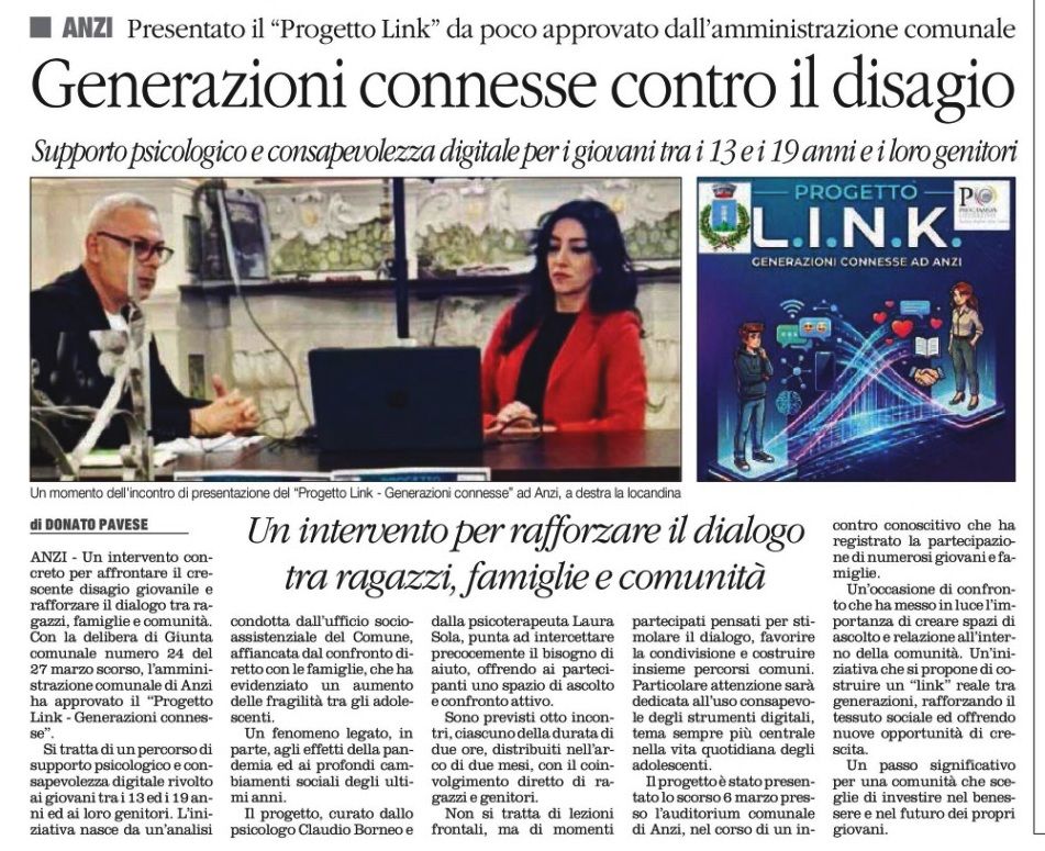 ANZI - Un intervento concreto per affrontare il crescente disagio giovanile e rafforzare il dialogo tra ragazzi, famiglie e comunità. Con la delibera di Giunta comunale n. 24 del 27 marzo, l’amministrazione di Anzi ha approvato il “Progetto Link - Generazioni connesse”, un percorso di supporto psicologico e consapevolezza digitale rivolto ai giovani tra i 13 ed i 19 anni ed ai loro genitori. L’iniziativa nasce da un’analisi condotta dall’ufficio socio-assistenziale del Comune, affiancata dal confronto diretto con le famiglie, che ha evidenziato un aumento delle fragilità tra gli adolescenti. Un fenomeno legato, in parte, agli effetti della pandemia ed ai profondi cambiamenti sociali degli ultimi anni. Il progetto, curato dallo psicologo Claudio Borneo e dalla psicoterapeuta Laura Sola, punta ad intercettare precocemente il bisogno di aiuto, offrendo ai partecipanti uno spazio di ascolto e confronto attivo. Sono previsti otto incontri, ciascuno della durata di due ore, distribuiti nell’arco di due mesi, con il coinvolgimento diretto di ragazzi e genitori. Non si tratta di lezioni frontali, ma di momenti partecipati pensati per stimolare il dialogo, favorire la condivisione e costruire insieme percorsi comuni. Particolare attenzione sarà dedicata all’uso consapevole degli strumenti digitali, tema sempre più centrale nella vita quotidiana degli adolescenti. Il progetto è stato presentato lo scorso 6 marzo presso l’auditorium comunale di Anzi, nel corso di un incontro conoscitivo che ha registrato la partecipazione di numerosi giovani e famiglie. Un’occasione di confronto che ha messo in luce l’importanza di creare spazi di ascolto e relazione all’interno della comunità. Un’iniziativa che si propone di costruire un “link” reale tra generazioni, rafforzando il tessuto sociale ed offrendo nuove opportunità di crescita. Un passo significativo per una comunità che sceglie di investire nel benessere e nel futuro dei propri giovani. (Donato Pavese)