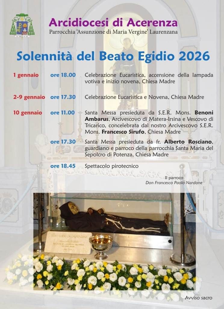 LAURENZANA - Solenne festa del Beato Egidio da Laurenzana 2026 - Il programma completo delle celebrazioni in Chiesa Madre