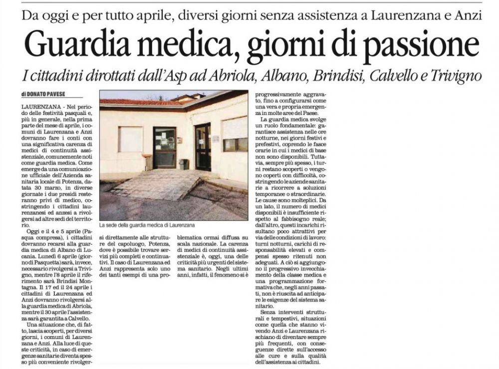 LAURENZANA - Nel periodo delle festività pasquali e, più in generale, nella prima parte del mese di aprile, i comuni di Laurenzana ed Anzi dovranno fare i conti con una significativa carenza di medici di continuità assistenziale, comunemente nota come guardia medica. Come emerge da una comunicazione ufficiale dell’Azienda sanitaria locale di Potenza, datata 30 marzo, in diverse giornate i due presidi resteranno privi di medico, costringendo i cittadini laurenzanesi ed anzesi a rivolgersi ad altre sedi del territorio. Nel dettaglio, nei giorni 2, 4 e 5 aprile (Pasqua compresa), i cittadini dovranno recarsi presso la guardia medica di Albano di Lucania. Lunedì 6 aprile (giorno di Pasquetta) sarà, invece, necessario rivolgersi a Trivigno, mentre l’8 aprile il riferimento sarà Brindisi Montagna. Il 17 ed il 24 aprile i cittadini di Laurenzana ed Anzi dovranno rivolgersi alla guardia medica di Abriola, mentre il 30 aprile l’assistenza sarà garantita a Calvello. Una situazione che, di fatto, lascia scoperti, per diversi giorni, i comuni di Laurenzana ed Anzi. Alla luce di queste criticità, in caso di emergenze sanitarie diventa spesso più conveniente rivolgersi direttamente alle strutture del capoluogo, Potenza, dove è possibile trovare servizi più completi e continuativi. Il caso di Laurenzana ed Anzi rappresenta solo uno dei tanti esempi di una problematica ormai diffusa su scala nazionale. La carenza di medici di continuità assistenziale è, oggi, una delle criticità più urgenti del sistema sanitario. Negli ultimi anni, infatti, il fenomeno si è progressivamente aggravato, fino a configurarsi come una vera e propria emergenza in molte aree del Paese. La guardia medica svolge un ruolo fondamentale: garantisce assistenza nelle ore notturne, nei giorni festivi e prefestivi, coprendo le fasce orarie in cui i medici di base non sono disponibili. Tuttavia, sempre più spesso, i turni restano scoperti o vengono coperti con difficoltà, costringendo le aziende sanitarie a ricorrere a soluzioni temporanee o straordinarie. Le cause sono molteplici. Da un lato, il numero di medici disponibili è insufficiente rispetto al fabbisogno reale; dall’altro, questi incarichi risultano poco attrattivi per via delle condizioni di lavoro: turni notturni, carichi di responsabilità elevati e compensi spesso ritenuti non adeguati. A ciò si aggiungono il progressivo invecchiamento della classe medica ed una programmazione formativa che, negli anni passati, non è riuscita ad anticipare le esigenze del sistema sanitario. Senza interventi strutturali e tempestivi, situazioni come quella che stanno vivendo Anzi e Laurenzana rischiano di diventare sempre più frequenti, con conseguenze dirette sull’accesso alle cure e sulla qualità dell’assistenza per i cittadini. (Donato Pavese)