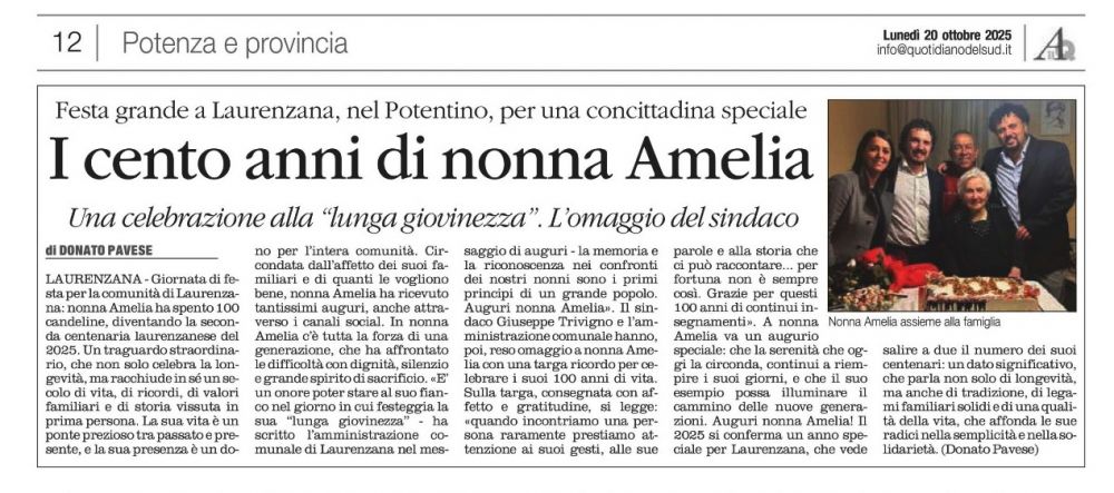 LAURENZANA - Giornata di festa per la comunità di Laurenzana: nonna Amelia ha spento 100 candeline, diventando la seconda centenaria laurenzanese del 2025. Un traguardo straordinario, che non solo celebra la longevità, ma racchiude in sé un secolo di vita, di ricordi, di valori familiari e di storia vissuta in prima persona. La sua vita è un ponte prezioso tra passato e presente, e la sua presenza è un dono per l’intera comunità. Circondata dall’affetto dei suoi familiari e di quanti le vogliono bene, nonna Amelia ha ricevuto tantissimi auguri, anche attraverso i canali social. In nonna Amelia c’è tutta la forza di una generazione, che ha affrontato le difficoltà con dignità, silenzio e grande spirito di sacrificio. «E’ un onore poter stare al suo fianco nel giorno in cui festeggia la sua "lunga giovinezza" - ha scritto l’amministrazione comunale di Laurenzana nel messaggio di auguri - la memoria e la riconoscenza nei confronti dei nostri nonni sono i primi principi di un grande popolo. Auguri nonna Amelia». Il sindaco Giuseppe Trivigno e l’amministrazione comunale hanno, poi, reso omaggio a nonna Amelia con una targa ricordo per celebrare i suoi 100 anni di vita. Sulla targa, consegnata con affetto e gratitudine, si legge: «quando incontriamo una persona raramente prestiamo attenzione ai suoi gesti, alle sue parole e alla storia che ci può raccontare... per fortuna non è sempre così. Grazie per questi 100 anni di continui insegnamenti». A nonna Amelia va un augurio speciale: che la serenità che oggi la circonda, continui a riempire i suoi giorni, e che il suo esempio possa illuminare il cammino delle nuove generazioni. Auguri nonna Amelia! Il 2025 si conferma un anno speciale per Laurenzana, che vede salire a due il numero dei suoi centenari: un dato significativo, che parla non solo di longevità, ma anche di tradizione, di legami familiari solidi e di una qualità della vita, che affonda le sue radici nella semplicità e nella solidarietà. (Donato Pavese)