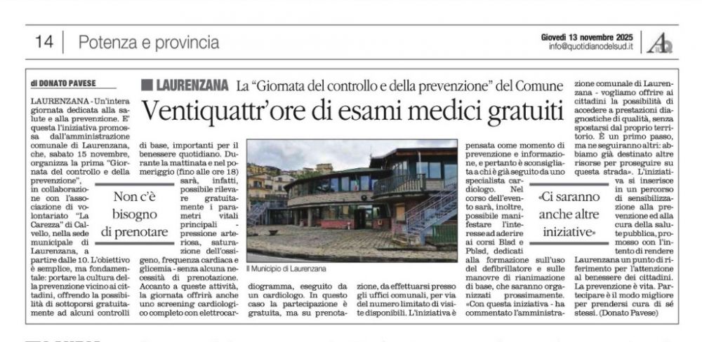 LAURENZANA - Un'intera giornata dedicata alla salute ed alla prevenzione. E' questa l'iniziativa promossa dall'amministrazione comunale di Laurenzana, che, sabato 15 novembre, organizza la prima “Giornata del controllo e della prevenzione”, in collaborazione con l'associazione di volontariato “La Carezza” di Calvello, presso la sede municipale di Laurenzana, a partire dalle ore 10. L'obiettivo è semplice, ma fondamentale: portare la cultura della prevenzione vicino ai cittadini, offrendo la possibilità di sottoporsi gratuitamente ad alcuni controlli di base, importanti per il benessere quotidiano. Durante la mattinata e nel pomeriggio (fino alle ore 18) sarà, infatti, possibile rilevare gratuitamente i parametri vitali principali - pressione arteriosa, saturazione dell'ossigeno, frequenza cardiaca e glicemia - senza alcuna necessità di prenotazione. Accanto a queste attività, la giornata offrirà anche uno screening cardiologico completo con elettrocardiogramma, eseguito da un cardiologo (per quest'ultima attività i posti sono già esauriti). Nel corso dell'evento sarà, inoltre, possibile manifestare l'interesse ad aderire ai corsi Blsd e Pblsd, dedicati alla formazione sull'uso del defibrillatore e sulle manovre di rianimazione di base, che saranno organizzati prossimamente. «Con questa iniziativa - ha commentato l'amministrazione comunale di Laurenzana - vogliamo offrire ai cittadini la possibilità di accedere a prestazioni diagnostiche di qualità, senza spostarsi dal proprio territorio. È un primo passo, ma ne seguiranno altri: abbiamo già destinato altre risorse per proseguire su questa strada». L'iniziativa si inserisce in un percorso di sensibilizzazione alla prevenzione ed alla cura della salute pubblica, promosso con l'intento di rendere Laurenzana un punto di riferimento per l'attenzione al benessere dei cittadini. La prevenzione è vita. Partecipare è il modo migliore per prendersi cura di sé stessi. (Donato Pavese)