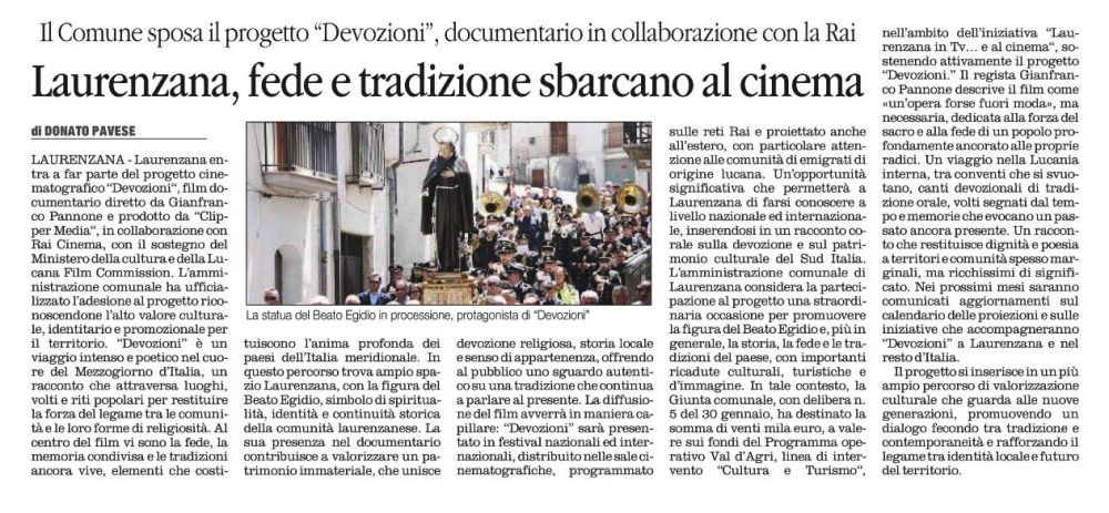 LAURENZANA - Laurenzana entra a far parte del progetto cinematografico "Devozioni", film documentario diretto da Gianfranco Pannone e prodotto da "Clipper Media", in collaborazione con Rai Cinema, con il sostegno del Ministero della cultura (Mic) e della Lucana Film Commission. L’amministrazione comunale ha ufficializzato l’adesione al progetto riconoscendone l’alto valore culturale, identitario e promozionale per il territorio. "Devozioni" è un viaggio intenso e poetico nel cuore del Mezzogiorno d’Italia, un racconto che attraversa luoghi, volti e riti popolari per restituire la forza del legame tra le comunità e le loro forme di religiosità. Al centro del film vi sono la fede, la memoria condivisa e le tradizioni ancora vive, elementi che costituiscono l’anima profonda dei paesi dell’Italia meridionale. In questo percorso trova ampio spazio Laurenzana, con la figura del Beato Egidio, simbolo di spiritualità, identità e continuità storica della comunità laurenzanese. La sua presenza nel documentario contribuisce a valorizzare un patrimonio immateriale, che unisce devozione religiosa, storia locale e senso di appartenenza, offrendo al pubblico uno sguardo autentico su una tradizione che continua a parlare al presente. La diffusione del film avverrà in maniera capillare: "Devozioni" sarà presentato in festival nazionali ed internazionali, distribuito nelle sale cinematografiche, programmato sulle reti Rai e proiettato anche all’estero, con particolare attenzione alle comunità di emigrati di origine lucana. Un’opportunità significativa che permetterà a Laurenzana di farsi conoscere a livello nazionale ed internazionale, inserendosi in un racconto corale sulla devozione e sul patrimonio culturale del Sud Italia. L’amministrazione comunale di Laurenzana considera la partecipazione al progetto una straordinaria occasione per promuovere la figura del Beato Egidio e, più in generale, la storia, la fede e le tradizioni del paese, con importanti ricadute culturali, turistiche e d’immagine. In tale contesto, la Giunta comunale, con delibera n. 5 del 30 gennaio, ha destinato la somma di venti mila euro, a valere sui fondi del Programma operativo Val d'Agri, linea di intervento "Cultura e Turismo", nell’ambito dell’iniziativa "Laurenzana in Tv… e al cinema", sostenendo attivamente il progetto "Devozioni". Il regista Gianfranco Pannone descrive il film come «un’opera forse fuori moda», ma necessaria, dedicata alla forza del sacro e alla fede di un popolo profondamente ancorato alle proprie radici. Un viaggio nella Lucania interna, tra conventi che si svuotano, canti devozionali di tradizione orale, volti segnati dal tempo e memorie che evocano un passato ancora presente. Un racconto che restituisce dignità e poesia a territori e comunità spesso marginali, ma ricchissimi di significato. Nei prossimi mesi saranno comunicati aggiornamenti sul calendario delle proiezioni e sulle iniziative che accompagneranno "Devozioni" a Laurenzana e nel resto d’Italia. Il progetto si inserisce in un più ampio percorso di valorizzazione culturale che guarda alle nuove generazioni, promuovendo un dialogo fecondo tra tradizione e contemporaneità e rafforzando il legame tra identità locale e futuro del territorio. (Donato Pavese)