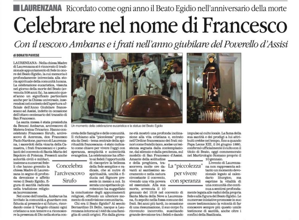 LAURENZANA - Nella chiesa Madre di Laurenzana si è rinnovato il tradizionale appuntamento di fede in onore del Beato Egidio, la cui memoria è profondamente intrecciata alla storia spirituale della comunità lucana. La celebrazione eucaristica, vissuta nel giorno della morte del Beato (avvenuta 508 anni fa), ha assunto quest'anno un significato particolare anche per la Chiesa universale, inserendosi nel contesto dell'apertura ufficiale dell'Anno Giubilare francescano ad Assisi, indetto in occasione dell'ottavo centenario del transito di San Francesco. La santa messa è stata presieduta da mons. Benoni Ambăruş, arcivescovo di Matera-Irsina-Tricarico. Hanno concelebrato mons. Francesco Sirufo, arcivescovo di Acerenza, don Francesco Paolo Nardone, parroco di Laurenzana, i sacerdoti della vicaria della Camastra, i frati francescani e i postulanti del convento di Santa Maria del Sepolcro di Potenza. Presenti anche autorità civili e militari, insieme a numerosi fedeli che hanno gremito la chiesa Madre di Laurenzana in segno di profonda devozione e affetto verso il Beato Egidio, figura di santità radicata nella tradizione religiosa laurenzanese. Nel corso dell'omelia, mons. Benoni Ambăruş ha invitato la comunità a guardare con fiducia al presente e al futuro, ricordando come il Vangelo chiami ogni cristiano a non temere e a riconoscere la presenza di Dio nella storia concreta delle famiglie e delle comunità. Il richiamo alla “piccolezza” proposta da Gesù - tema centrale della spiritualità francescana - è stato indicato come chiave per vivere l'oggi con speranza, semplicità e autenticità evangelica. La celebrazione ha offerto ai fedeli l'opportunità di riscoprire la bellezza della fede semplice e radicale, che si nutre di spiritualità, umiltà e fiducia nel Signore presente in mezzo a noi. In serata uno spettacolo pirotecnico ha suggellato la conclusione degli appuntamenti religiosi, offrendo un ulteriore momento di condivisione comunitaria. Chi era il Beato Egidio? Al secolo Bernardino Di Bello, nacque a Laurenzana intorno al 1443 da una famiglia di umili origini. Fin dalla giovane età mostrò una profonda inclinazione alla vita cristiana e, entrato nell'Ordine francescano dei frati minori come fratello laico, scelse un'esistenza segnata dalla contemplazione, dal silenzio e dalla penitenza, sul modello di San Francesco d'Assisi. Amante della solitudine e della preghiera, trascorreva molte ore davanti al santissimo sacramento e nella natura circostante il convento, vivendo una vita povera ed essenziale. Alla sua morte, avvenuta il 10 gennaio del 1518 nel convento di Santa Maria della Neve a Laurenzana, fu sepolto nella fossa comune dei frati. Sei anni più tardi, in occasione di una riesumazione, il suo corpo fu rinvenuto incorrotto, suscitando grande devozione tra i fedeli e dando impulso al culto locale. La fama della sua santità e dei prodigi a lui attribuiti crebbe nel tempo, fino a quando Papa Leone XIII, il 24 giugno 1880, confermò ufficialmente il culto con il titolo di Beato, oggi commemorato nel Martirologio Romano proprio il 10 gennaio. L'evento di Laurenzana non rappresenta soltanto un momento devozionale legato al calendario liturgico, ma esprime la vitalità di una comunità che continua a sentirsi profondamente legata alle radici della propria fede e alla figura del Beato Egidio. Le numerose iniziative promosse in suo onore testimoniano la volontà di far conoscere sempre più questo umile testimone di santità, anche oltre i confini della Basilicata. (Donato Pavese)
