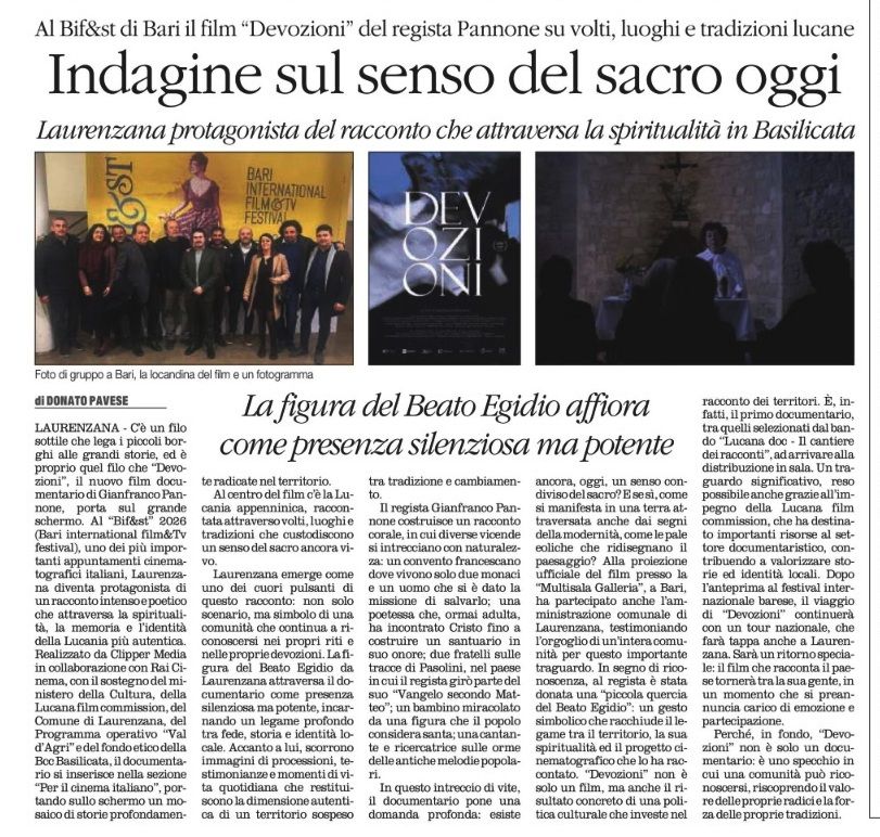 LAURENZANA - C’è un filo sottile che lega i piccoli borghi alle grandi storie, ed è proprio quel filo che “Devozioni”, il nuovo film documentario di Gianfranco Pannone, porta sul grande schermo. Al "Bif&st" 2026 (Bari international film&Tv festival), uno dei più importanti appuntamenti cinematografici italiani, Laurenzana diventa protagonista di un racconto intenso e poetico che attraversa la spiritualità, la memoria e l’identità della Lucania più autentica. Realizzato da "Clipper Media" in collaborazione con Rai Cinema, con il sostegno del Ministero della cultura, della Lucana film commission, del Comune di Laurenzana, del Programma operativo “Val d’Agri” e del fondo etico della Bcc Basilicata, il documentario si inserisce nella sezione “Per il cinema italiano”, portando sullo schermo un mosaico di storie profondamente radicate nel territorio. Al centro del film c’è la Lucania appenninica, raccontata attraverso volti, luoghi e tradizioni che custodiscono un senso del sacro ancora vivo. Laurenzana emerge come uno dei cuori pulsanti di questo racconto: non solo scenario, ma simbolo di una comunità che continua a riconoscersi nei propri riti e nelle proprie devozioni. La figura del Beato Egidio da Laurenzana attraversa il documentario come presenza silenziosa ma potente, incarnando un legame profondo tra fede, storia e identità locale. Accanto a lui, scorrono immagini di processioni, testimonianze e momenti di vita quotidiana che restituiscono la dimensione autentica di un territorio sospeso tra tradizione e cambiamento. Il regista Gianfranco Pannone costruisce un racconto corale, in cui diverse vicende si intrecciano con naturalezza: un convento francescano dove vivono solo due monaci e un uomo che si è dato la missione di salvarlo; una poetessa che, ormai adulta, ha incontrato Cristo fino a costruire un santuario in suo onore; due fratelli sulle tracce di Pasolini, nel paese in cui il regista girò parte del suo “Vangelo secondo Matteo”; un bambino miracolato da una figura che il popolo considera santa; una cantante e ricercatrice sulle orme delle antiche melodie popolari. In questo intreccio di vite, il documentario pone una domanda profonda: esiste ancora, oggi, un senso condiviso del sacro? E se sì, come si manifesta in una terra attraversata anche dai segni della modernità, come le pale eoliche che ridisegnano il paesaggio? Alla proiezione ufficiale del film presso la “Multisala Galleria”, a Bari, ha partecipato anche l’amministrazione comunale di Laurenzana, testimoniando l’orgoglio di un’intera comunità per questo importante traguardo. In segno di riconoscenza, al regista è stata donata una “piccola quercia del Beato Egidio”: un gesto simbolico che racchiude il legame tra il territorio, la sua spiritualità ed il progetto cinematografico che lo ha raccontato. “Devozioni” non è solo un film, ma anche il risultato concreto di una politica culturale che investe nel racconto dei territori. È, infatti, il primo documentario, tra quelli selezionati dal bando “Lucana doc - Il cantiere dei racconti”, ad arrivare alla distribuzione in sala. Un traguardo significativo, reso possibile anche grazie all’impegno della Lucana film commission, che ha destinato importanti risorse al settore documentaristico, contribuendo a valorizzare storie ed identità locali. Dopo l’anteprima al festival internazionale barese, il viaggio di “Devozioni” continuerà con un tour nazionale, che farà tappa anche a Laurenzana. Sarà un ritorno speciale: il film che racconta il paese tornerà tra la sua gente, in un momento che si preannuncia carico di emozione e partecipazione. Perché, in fondo, “Devozioni” non è solo un documentario: è uno specchio in cui una comunità può riconoscersi, riscoprendo il valore delle proprie radici e la forza delle proprie tradizioni. (Donato Pavese)
