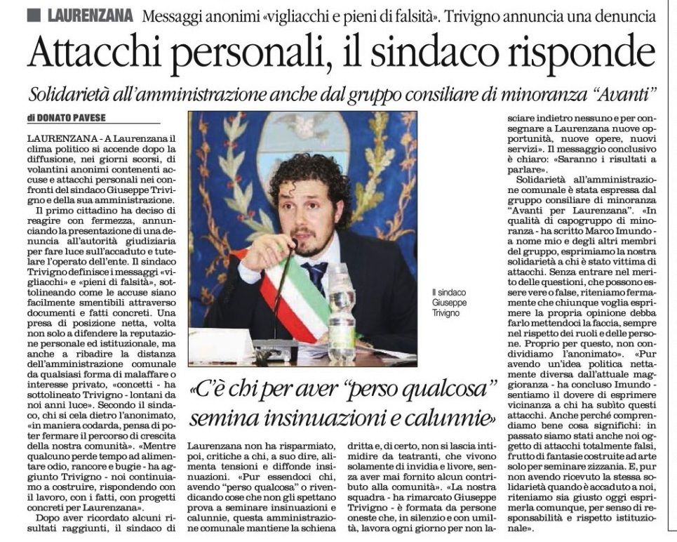 Laurenzana: volantini anonimi contro sindaco e amministrazione. Giuseppe Trivigno denuncia e contrattacca: «C'è chi avendo “perso qualcosa” semina insinuazioni e calunnie». Solidarietà dal gruppo di minoranza