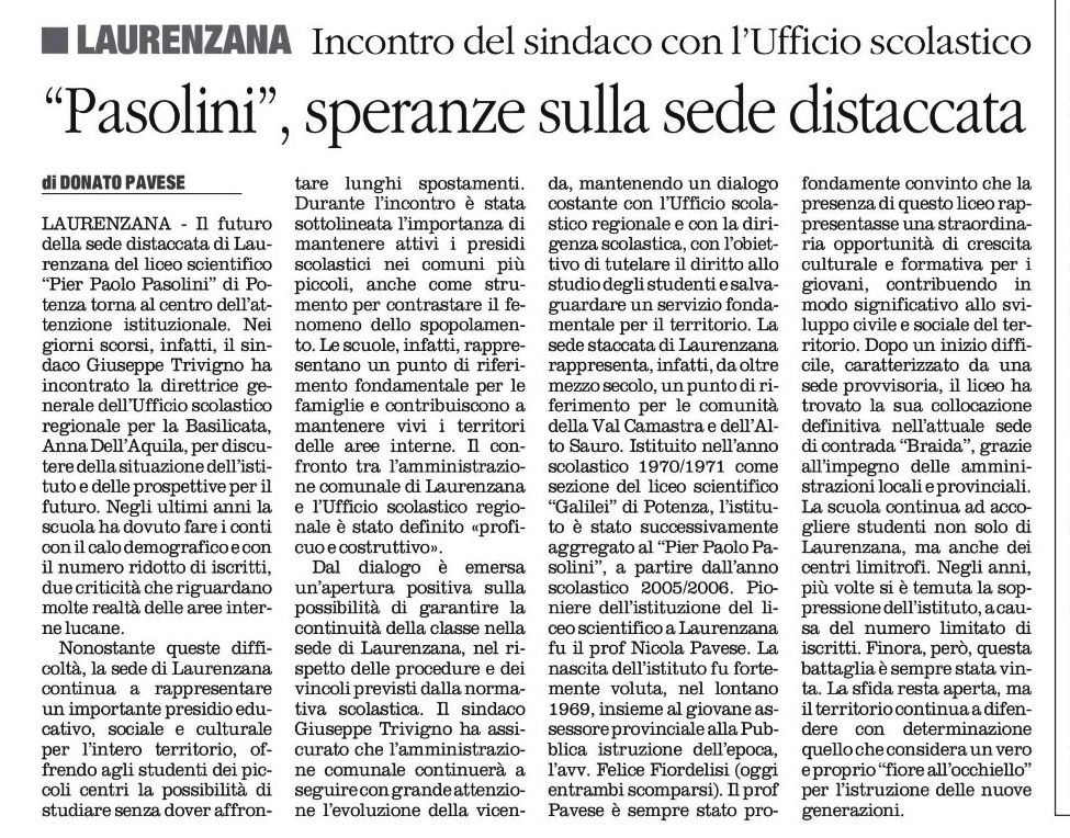 LAURENZANA - Il futuro della sede distaccata di Laurenzana del liceo scientifico "Pier Paolo Pasolini” di Potenza torna al centro dell’attenzione istituzionale. Nei giorni scorsi, infatti, il sindaco Giuseppe Trivigno ha incontrato la direttrice generale dell’Ufficio scolastico regionale per la Basilicata, Anna Dell’Aquila, per discutere della situazione dell’istituto e delle prospettive per il futuro. Negli ultimi anni la scuola ha dovuto fare i conti con il calo demografico e con il numero ridotto di iscritti, due criticità che riguardano molte realtà delle aree interne lucane. Nonostante queste difficoltà, la sede di Laurenzana continua a rappresentare un importante presidio educativo, sociale e culturale per l’intero territorio, offrendo agli studenti dei piccoli centri la possibilità di studiare senza dover affrontare lunghi spostamenti. Durante l’incontro è stata sottolineata l’importanza di mantenere attivi i presidi scolastici nei comuni più piccoli, anche come strumento per contrastare il fenomeno dello spopolamento. Le scuole, infatti, rappresentano un punto di riferimento fondamentale per le famiglie e contribuiscono a mantenere vivi i territori delle aree interne. Il confronto tra l’amministrazione comunale di Laurenzana e l’Ufficio scolastico regionale è stato definito «proficuo e costruttivo». Dal dialogo è emersa un’apertura positiva sulla possibilità di garantire la continuità della classe nella sede di Laurenzana, nel rispetto delle procedure e dei vincoli previsti dalla normativa scolastica. Il sindaco Giuseppe Trivigno ha assicurato che l’amministrazione comunale continuerà a seguire con grande attenzione l’evoluzione della vicenda, mantenendo un dialogo costante con l’Ufficio scolastico regionale e con la dirigenza scolastica, con l’obiettivo di tutelare il diritto allo studio degli studenti e salvaguardare un servizio fondamentale per il territorio. La sede distaccata di Laurenzana rappresenta, infatti, da oltre mezzo secolo, un punto di riferimento per le comunità della Val Camastra e dell’Alto Sauro. Istituito nell’anno scolastico 1970/1971 come sezione del liceo scientifico “Galilei” di Potenza, l’istituto è stato successivamente aggregato al “Pier Paolo Pasolini”, a partire dall’anno scolastico 2005/2006. Pioniere dell’istituzione del liceo scientifico a Laurenzana fu il prof Nicola Pavese. La nascita dell’istituto fu fortemente voluta, nel lontano 1969, insieme al giovane assessore provinciale alla Pubblica istruzione dell’epoca, l’avv. Felice Fiordelisi (oggi entrambi scomparsi). Il prof Pavese è sempre stato profondamente convinto che la presenza di questo liceo rappresentasse una straordinaria opportunità di crescita culturale e formativa per i giovani, contribuendo in modo significativo allo sviluppo civile e sociale del territorio. Dopo un inizio difficile, caratterizzato da una sede provvisoria, il liceo ha trovato la sua collocazione definitiva nell’attuale sede di contrada “Braida”, grazie all’impegno delle amministrazioni locali e provinciali. La scuola continua ad accogliere studenti non solo di Laurenzana, ma anche dei centri limitrofi. Negli anni, più volte si è temuta la soppressione dell’istituto, a causa del numero limitato di iscritti. Finora, però, questa battaglia è sempre stata vinta. La sfida resta aperta, ma il territorio continua a difendere con determinazione quello che considera un vero e proprio “fiore all’occhiello” per l’istruzione delle nuove generazioni. (Donato Pavese)