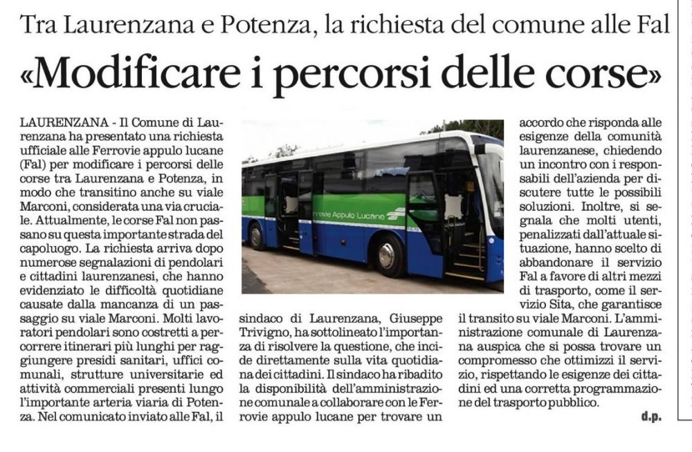 LAURENZANA - Il Comune di Laurenzana ha presentato una richiesta ufficiale alle Ferrovie appulo lucane (Fal) per modificare i percorsi delle corse tra Laurenzana e Potenza, in modo che transitino anche su viale Marconi, considerata una via cruciale. Attualmente, le corse Fal non passano su questa importante strada del capoluogo. La richiesta arriva dopo numerose segnalazioni di pendolari e cittadini laurenzanesi, che hanno evidenziato le difficoltà quotidiane causate dalla mancanza di un passaggio su viale Marconi. Molti lavoratori pendolari sono costretti a percorrere itinerari più lunghi per raggiungere presidi sanitari, uffici comunali, strutture universitarie ed attività commerciali presenti lungo l’importante arteria viaria di Potenza. Nel comunicato inviato alle Fal, il sindaco di Laurenzana, Giuseppe Trivigno, ha sottolineato l’importanza di risolvere la questione, che incide direttamente sulla vita quotidiana dei cittadini. Il sindaco ha ribadito la disponibilità dell’amministrazione comunale a collaborare con le Ferrovie appulo lucane per trovare un accordo che risponda alle esigenze della comunità laurenzanese, chiedendo un incontro con i responsabili dell’azienda per discutere tutte le possibili soluzioni. Inoltre, si segnala che molti utenti, penalizzati dall’attuale situazione, hanno scelto di abbandonare il servizio Fal a favore di altri mezzi di trasporto, come il servizio Sita, che garantisce il transito su viale Marconi. L’amministrazione comunale di Laurenzana auspica che si possa trovare un compromesso che ottimizzi il servizio, rispettando le esigenze dei cittadini ed una corretta programmazione del trasporto pubblico. (Donato Pavese)
