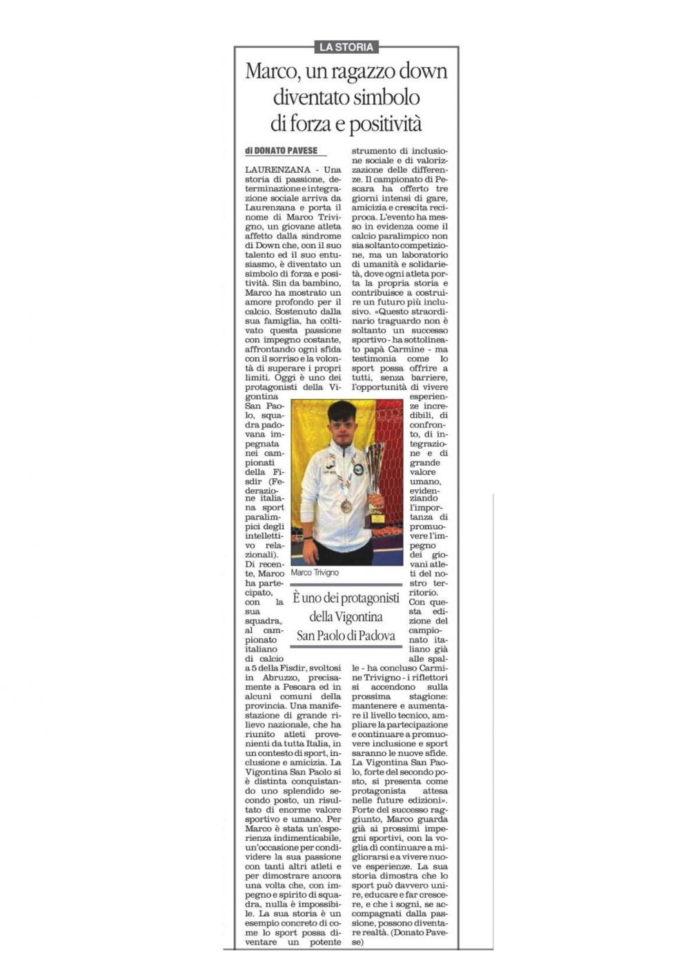 LAURENZANA - Una storia di passione, determinazione e integrazione sociale arriva da Laurenzana e porta il nome di Marco Trivigno, un giovane atleta affetto dalla sindrome di Down che, con il suo talento ed il suo entusiasmo, è diventato un simbolo di forza e positività. Sin da bambino, Marco ha mostrato un amore profondo per il calcio. Sostenuto dalla sua famiglia, ha coltivato questa passione con impegno costante, affrontando ogni sfida con il sorriso e la volontà di superare i propri limiti. Oggi è uno dei protagonisti della Vigontina San Paolo, squadra padovana impegnata nei campionati della Fisdir (Federazione italiana sport paralimpici degli intellettivo relazionali). Di recente, Marco ha partecipato, con la sua squadra, al campionato italiano di calcio a 5 della Fisdir, svoltosi in Abruzzo, precisamente a Pescara ed in alcuni comuni della provincia. Una manifestazione di grande rilievo nazionale, che ha riunito atleti provenienti da tutta Italia, in un contesto di sport, inclusione e amicizia. La Vigontina San Paolo si è distinta conquistando uno splendido secondo posto, un risultato di enorme valore sportivo e umano. Per Marco è stata un’esperienza indimenticabile, un’occasione per condividere la sua passione con tanti altri atleti e per dimostrare ancora una volta che, con impegno e spirito di squadra, nulla è impossibile. La sua storia è un esempio concreto di come lo sport possa diventare un potente strumento di inclusione sociale e di valorizzazione delle differenze. Il campionato di Pescara ha offerto tre giorni intensi di gare, amicizia e crescita reciproca. L’evento ha messo in evidenza come il calcio paralimpico non sia soltanto competizione, ma un laboratorio di umanità e solidarietà, dove ogni atleta porta la propria storia e contribuisce a costruire un futuro più inclusivo. «Questo straordinario traguardo non è soltanto un successo sportivo - ha sottolineato papà Carmine - ma testimonia come lo sport possa offrire a tutti, senza barriere, l’opportunità di vivere esperienze incredibili, di confronto, di integrazione e di grande valore umano, evidenziando l’importanza di promuovere l’impegno dei giovani atleti del nostro territorio. Con questa edizione del campionato italiano già alle spalle - ha concluso Carmine Trivigno - i riflettori si accendono sulla prossima stagione: mantenere e aumentare il livello tecnico, ampliare la partecipazione e continuare a promuovere inclusione e sport saranno le nuove sfide. La Vigontina San Paolo, forte del secondo posto, si presenta come protagonista attesa nelle future edizioni». Forte del successo raggiunto, Marco guarda già ai prossimi impegni sportivi, con la voglia di continuare a migliorarsi e a vivere nuove esperienze. La sua storia dimostra che lo sport può davvero unire, educare e far crescere, e che i sogni, se accompagnati dalla passione, possono diventare realtà. (Donato Pavese)