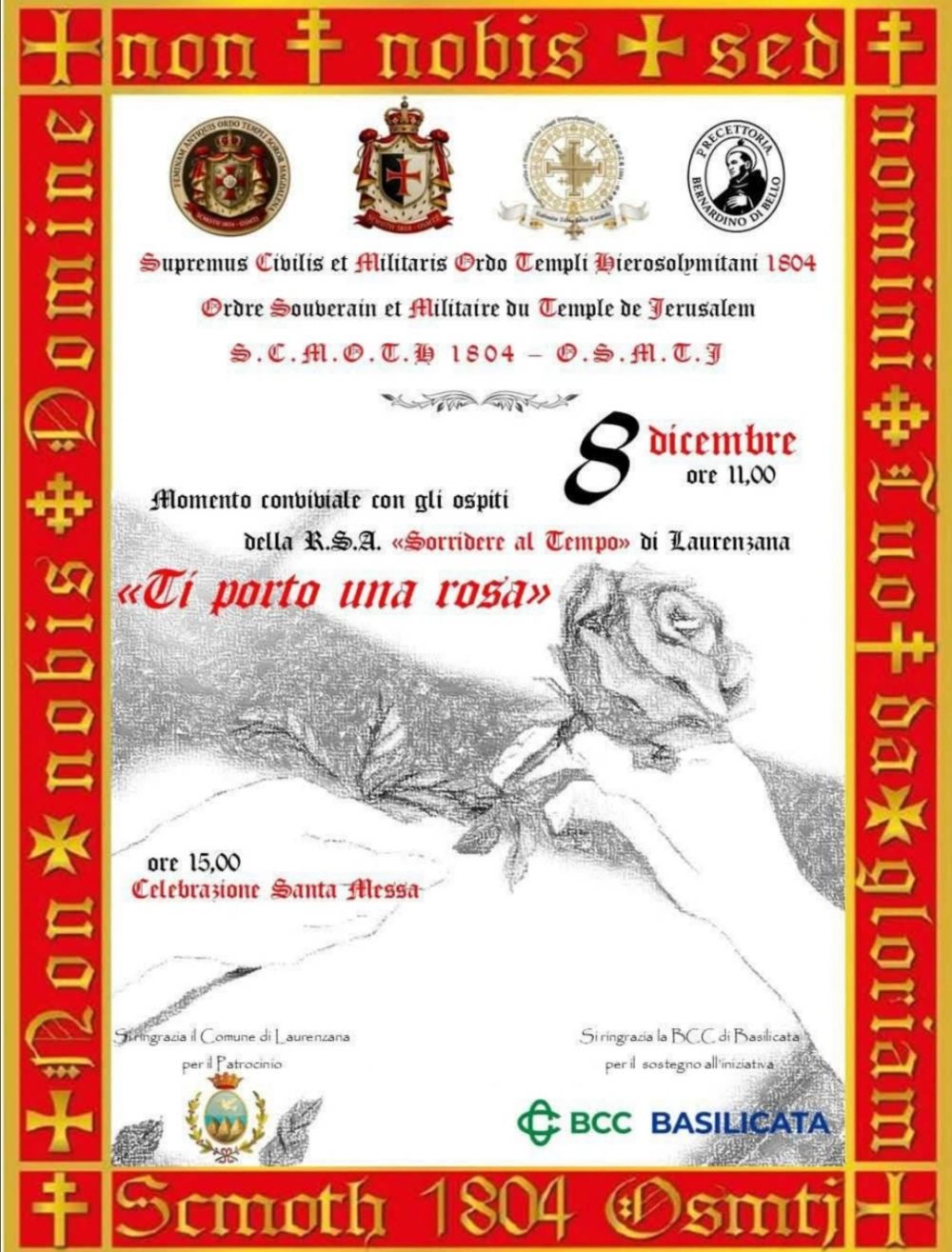 LAURENZANA - Nel segno della solidarietà e della condivisione, il "Supremus civilis et militaris ordo templi hierosolymitani 1804" (Scmoth 1804 - Osmtj) organizza, per lunedì 8 dicembre, una giornata speciale dedicata agli ospiti della Rsa (Residenza sanitaria assistenziale) "Sorridere al Tempo" di Laurenzana. L’iniziativa, intitolata "Ti porto una rosa", unisce valori di fraternità e attenzione verso gli anziani.